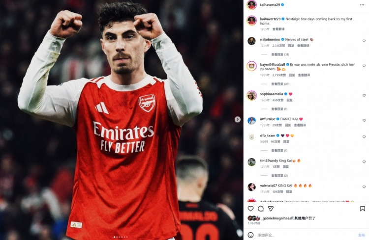 本场比赛哈弗茨面对旧主打进绝平点球,并且没有选择庆祝。赛后他也在个人社媒晒照写道:“回到我第一个家,最近几天充满怀旧之情。”